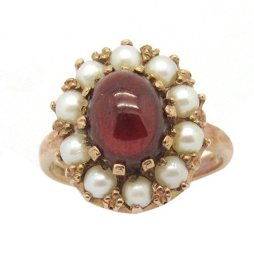 • Set with Large Polished Garnet Stone Surrounded by Sea Pearls