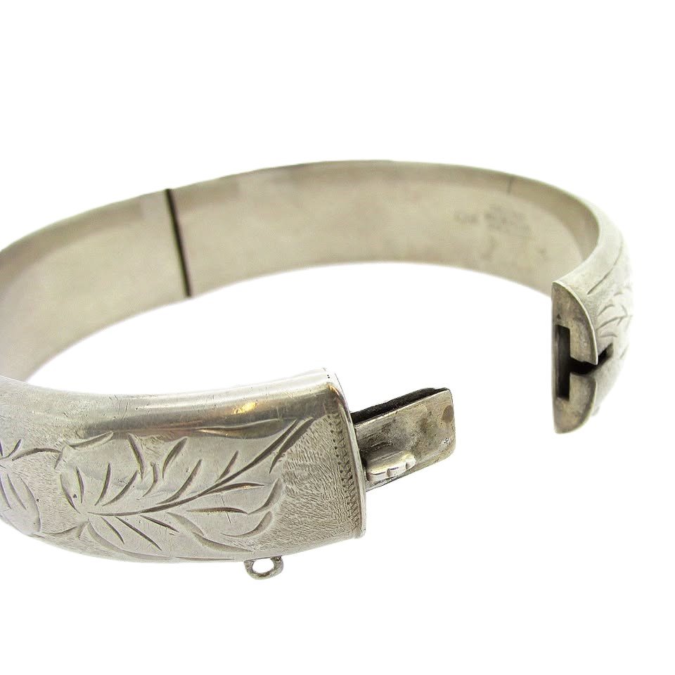 - Vintage Sterling Silver Hinged Bangle Engraved with Leaf Design